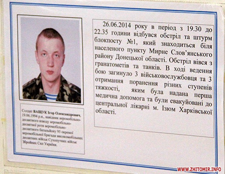 - солдат Ващук Ігор Олександрович, 19.06.1994 р.н., м. Овруч. Навідник аеромобільно-десантного взводу аеромобільно-десантної роти аеромобільно-десантного батальйону. Загинув 26 червня під час обстрілу та штурму блокпосту №1 поблизу села Мирне Слов’янського району. Обстріл вівся з гранатометів та танків.