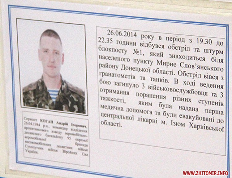 - сержант Коган Андрій Ігорович, 26.04.1984 р.н., родом з Вінницької області, проживав у селі Висока Піч Житомирського району. Загинув 26 червня під час обстрілу та штурму блокпосту №1 поблизу села Мирне Слов’янського району. Обстріл вівся з гранатометів та танків. Залишилась дружина та одна дитина.