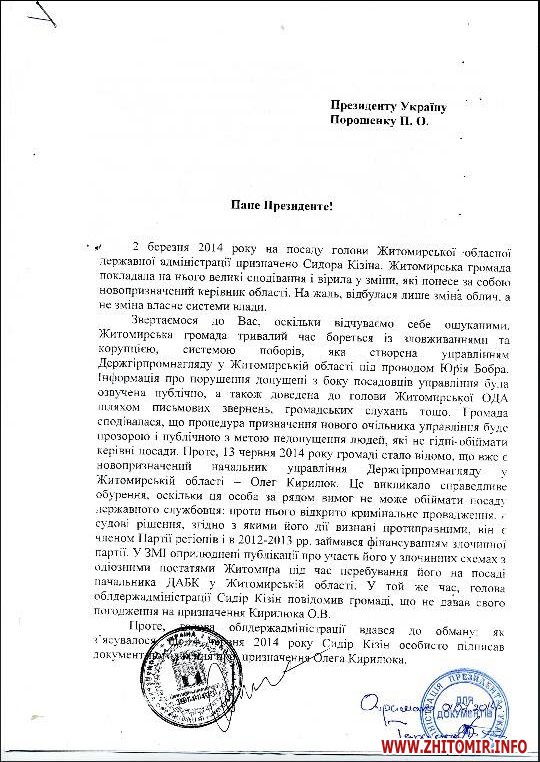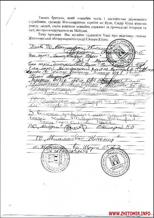 «Такого брехуна, який зганьбив честь і достоїнство державного службовця громада Житомирщини терпіти не буде, Сидір Кізін втратив довіру людей, своїм вчинком зганьбив державні та громадські інтереси та ідеї, які проголошувалися на Майдані. Тому просимо Вас негайно підписати указ про відставку голови Житомирської облдержадміністрації Сидора Кізіна», - йдеться у листі, який підписали члени та керівники близько десяти громадських організацій.