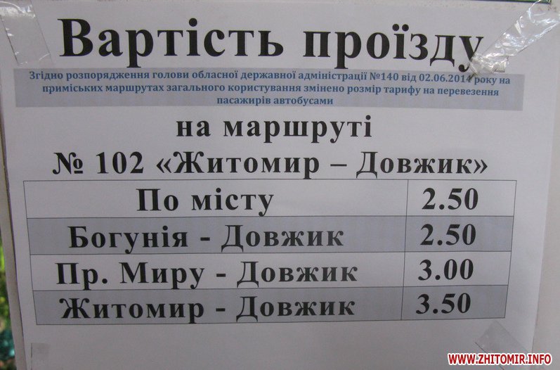 У Житомирській області вступило в дію розпорядження голови Житомирської облдержадміністрації Сидора Кізіна від 2 червня 2014 року «Про розмір тарифу на перевезення пасажирів автобусами, що працюють у звичайному режимі руху».