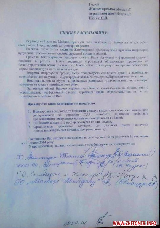 «Українці вийшли на Майдан, прагнучи змін на краще та гідного життя для себе і своїх родин. Народ переміг авторитарний режим. На жаль, після зміни влади на Житомирщині продовжується практика непрозорих кулуарних призначень на ключові державні посади в області… За чотири місяці Вашого керівництва областю громадськість не бачить змін у корумпованій, неефективній системі державної влади», - зазначають підписанти.