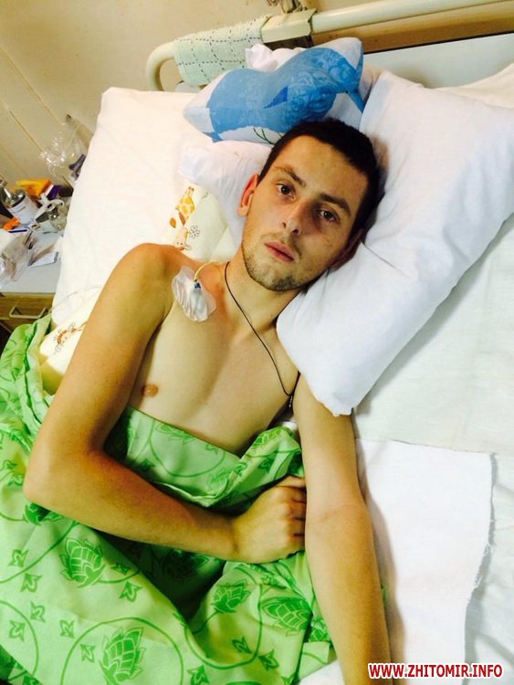 Віктор Мельнийчук, 35 років, житомирянин. Отримав уламком травму голови у зоні АТО 26 червня. На даний момент лікарі провели 2 операції - уламок потрапив у лобновісочну долю та роздробив кістку. Потребує коштів на лікування та реабілітацію, в родині двоє маленьких дітей. Картковий рахунок у Приватбанку 5168 7572 5303 1670 Мельнийчук Віктор Володимирович, картковий рахунок дружини Віктора 4627 0812 0396 5368 Мельнийчук Тетяна Сергіївна.