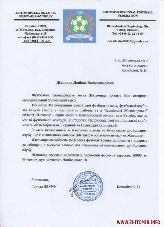 «З часів незалежності в Житомирі ніколи не було свого футбольного клубу, що є величезною ганьбою для такого обласного центру як Житомир», - наголошує Коцюбко в листі на ім’я Цимбалюк.