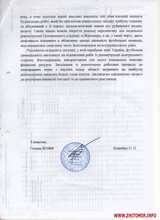 «Розуміючи складність ситуації, у якій перебуває нині Україна, футбольна громадськість наголошує на відновленні робіт із реконструкції центрального стадіону Житомирщини, використавши для цього мінімально можливі фінансові ресурси. Зволікання із ремонтними роботами призведе до непоправних втрат і змусить владу області витрачати на майбутні реконструкції набагато більші суми коштів. Закликаємо керівництво області до розуміння виниклої ситуації та до адекватного реагування», - звертається Коцюбко до губернатора Кізіна.