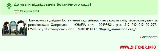 На сайте Житомирского национального агроуниверситета есть объявление: «Желающим посетить Ботанический сад университета средства следует перечислять по реквизитам».