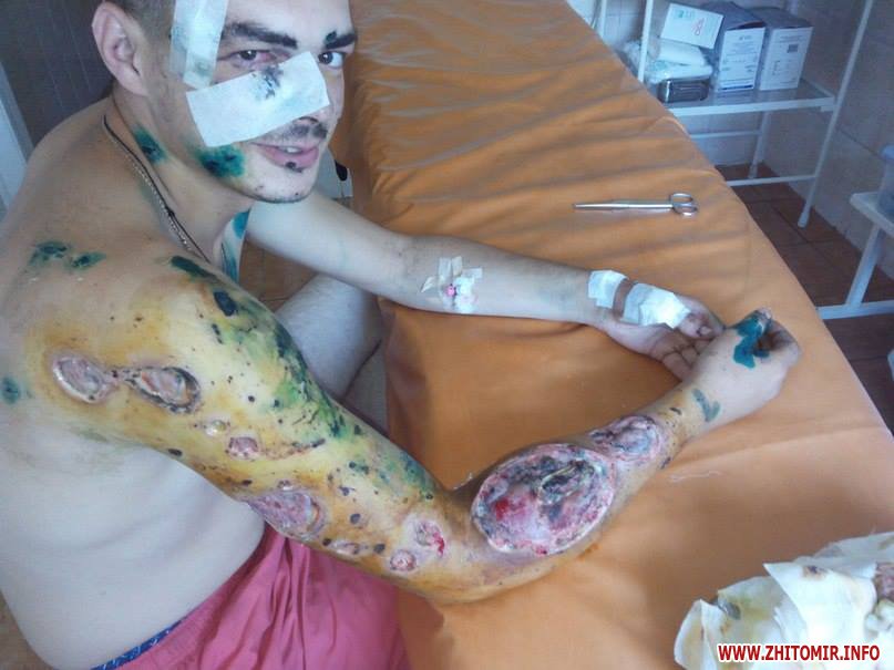 Вишемирський Артем Миколайович, 24 роки, з Бердичева, 95 бригада. 19 липня отримав поранення під Лисичанськом – осколкові поранення правої руки, спини, обличчя, очей. У Вінницькому шпиталі йому зробили кілька пересадок шкіри, попереду тривала реабілітація, на яку потрібні кошти.