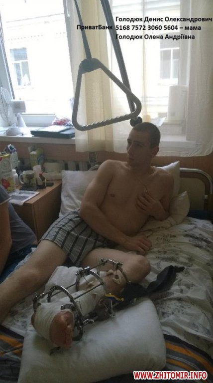 Голодюк Денис Олександрович, військовослужбовець 95-ї бригади. Отримав поранення від АГС-17 під Слов’янськом. Розривом гранати розірвало ногу: численні осколкові поранення, роздроблена кістка, немає сухожилля, артерії та 4 см кістки. Наразі перебуває у Київському військовому шпиталі.