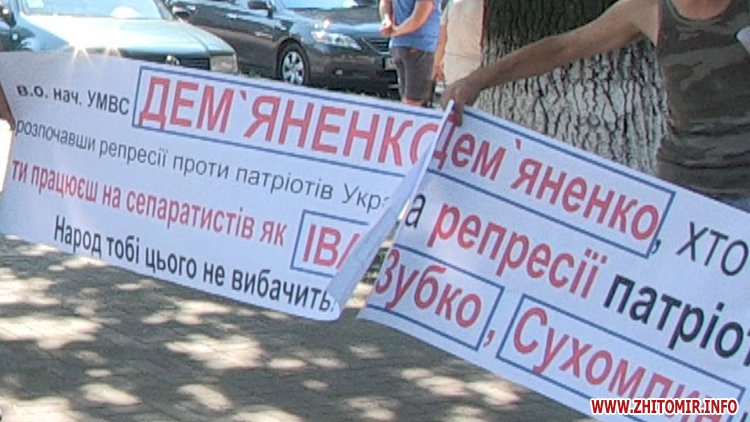 Активіст Андрій Федірко, якого викликають у міліцію у якості свідка по справі погрому російських банків, влаштував небагатолюдну акцію протесту під міським управлінням міліції. Виклик до міліції він розцінив як тиск на громадських активістів, тож розгорнув плакати з такими написами «Демяненко, допитай свої російські банки, чим вони допомогли українській армії і як фінансують сепаратистів», «Демяненко, розпочавши репресії проти патріотів України, ти працюєш на сепаратистів як Івакін, народ тобі цього не вибачить», «Демяненко, хто віддав наказ на репресії патріотів України?», «Зубко, Сухомлин, чи Івакін?», «За підтримку сепаратистів вимагаємо начальника УМВС у відставку». Також він озвучив своє невдоволення роботою начальника Демяненка.