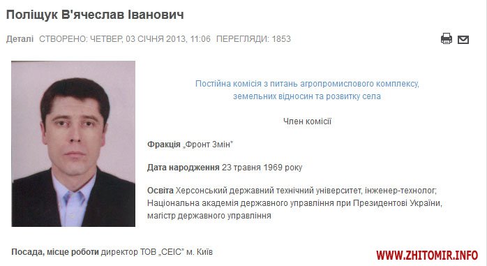 «Просимо всіх, хто має будь-яку інформацію щодо фактів можливої корупційної діяльності Поліщука В’ячеслава Івановича (23 травня 1969 року народження), який претендує на посаду заступника голови Житомирської ОДА повідомляти в контактний центр за телефоном 44-88-89 або 55-89-57. Всі вказані вами факти, які суперечать статусу держслужбовця, будуть передані на розгляд голові облдержадміністрації Сергію Машковському», - наголошує обласна влада.