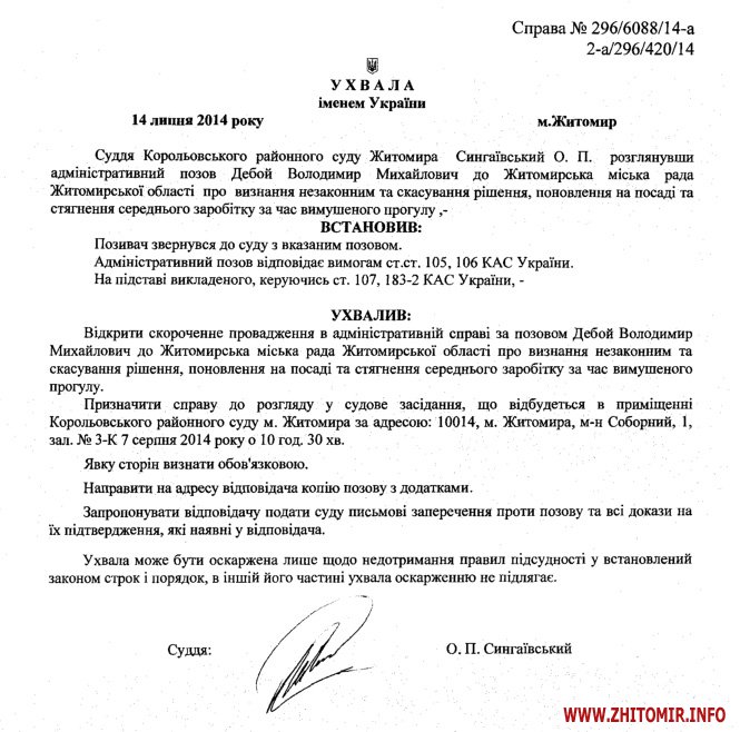 Напомним, что 10 июля Владимир Дебой подал в Королевский районный суд Житомира иск об отмене решения сессии Житомирского горсовета №627 от 25 февраля 2014 года «О досрочном прекращении полномочий городского главы Дебоя В.М.», восстановлении его в должности и выплаты средней зарплаты «за время вынужденного прогула».