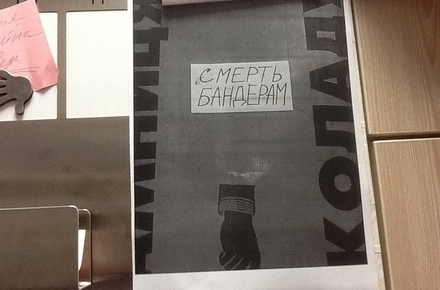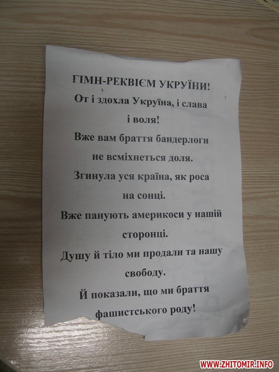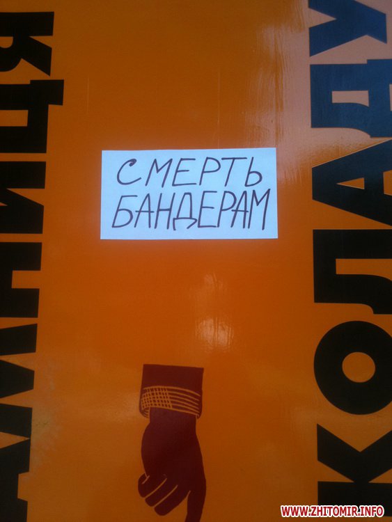 Працівники закладу розповіли Житомир.info, що кілька днів приходячи ранком на роботу бачать приклеєні двостороннім скотчем листівки чи то із закликом «Смерть бандерам», чи зі спотвореними словами Державного гімну.