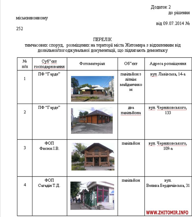 В решении исполкома «О демонтаже временных сооружений» указано, что павильон по улице Большая Бердичевская, 31, принадлежащий ФЛП Сагадин Т.Д., подлежит демонтажу в связи с тем, что он размещен с отклонениями от разрешительной или согласовательной документации.