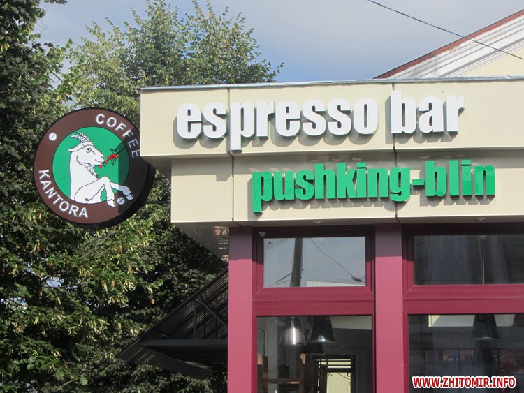 В Житомире по улице Большая Бердичевская, 31 возле памятника Пушкину открылся бар-кофейня. Судя по вывеске, недавно открытое заведение имеет несколько названий – «Эспрессо бар», «Пушкин-блин» и «Кофе кантора».