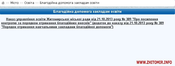 Зараз на сайті мерії в рубриці «Місто», розділі «Освіта», підрозділі «Благодійна допомога закладам освіти» опублікований Наказ управління освіти Житомирської міської ради від 21.10.2013 року № 389 «Про посилення контролю за порядком отримання благодійних внесків» (додаток до наказу від 21.10.2013 року № 389 «Порядок отримання навчальними закладами благодійної допомоги»).