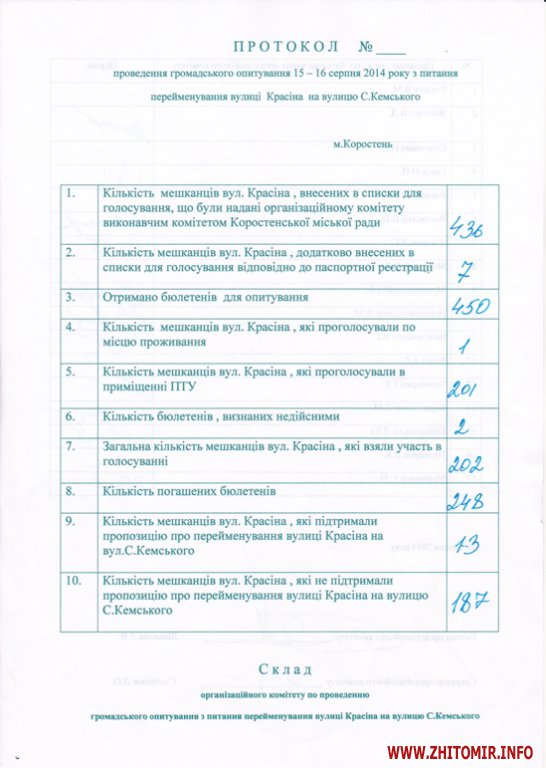15-16 серпня в Коростені відбулося консультативне опитування мешканців вулиці Красіна щодо перейменування на вулицю Кемського.