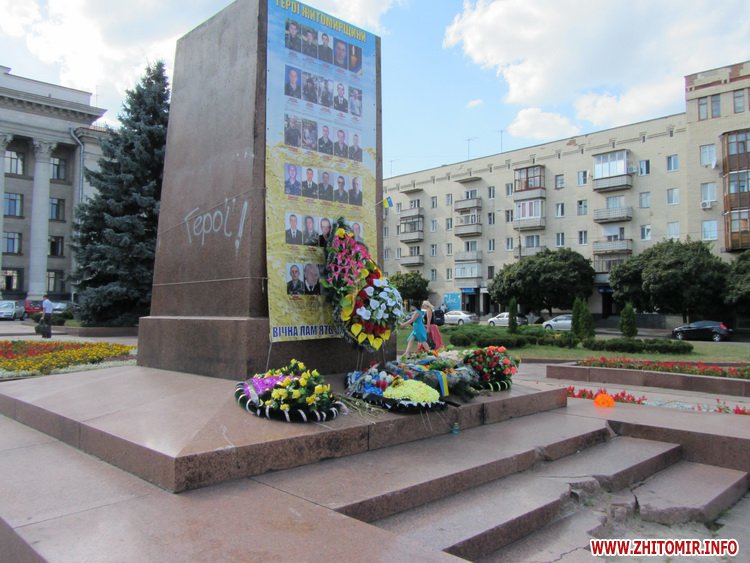 Десантники, зокрема і ті, які приїхали зі Сходу у відпустку, зібралися на площі Соборній, аби покласти вінок до постаменту, на якому раніше стояв пам’ятник Леніну, а нині висить плакат зі світлинами військових, загиблих в АТО, та героїв Небесної сотні.