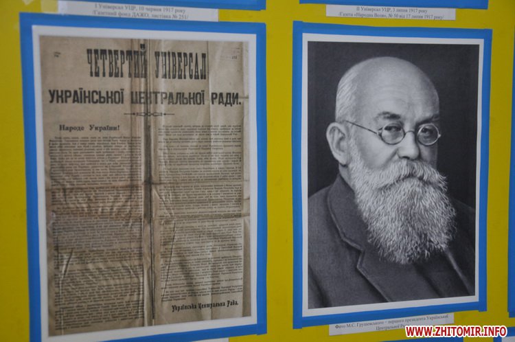 «Усі офіційні документи, що засвідчують період державотворення в України 1917–1920 та 1922 років включно, видалися Центральною Радою. Нині їх зберігають у відповідних музеях міста Києва. Тому на цій стендовій виставці ми представляємо, зокрема, копії сторінок із газетними матеріалами та окремих рішень органів виконавчої влади на місцях», - відкриваючи виставку, зазначив директор Державного архіву Житомирської області Станіслав Синицький.