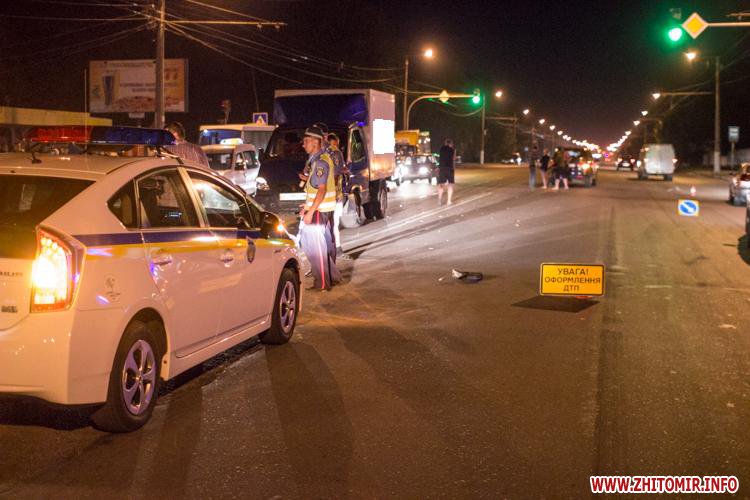 «Около 21.00 19 августа на перекрестке просп. Мира - ул. Жукова водитель автомобиля ГАЗ-3302, житель Житомира, 1983 года рождения, двигаясь по проспекту Мира в направлении ул. Ватутина, совершил наезд на мужчину, который пересекал проезжую часть справа налево по ходу движения автомобиля. В результате наезда пешехода отбросило на встречную полосу движения, где на него было совершено наезд автомобилем SsangYong, под управлением жительницы Житомира, 1974 года рождения, который двигался во встречном направлении», - информируют в Госавтоинспекции.