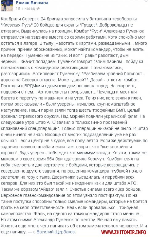 На своей странице в Facebook журналист телеканала «Интер» Роман Бочкала написал подробности боя, в котором погиб комбат «Киевской Руси» Александр Гуменюк и был ранен Эдуард Малеваный.