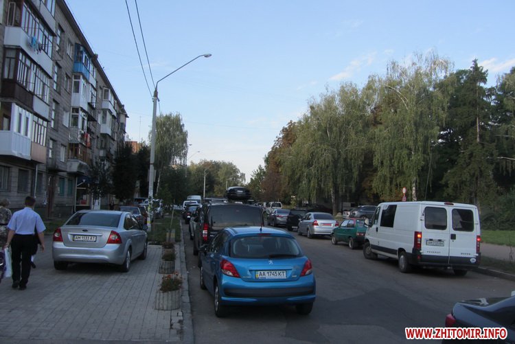 Вулиця Лятошинського, на якій знаходиться гімназія, заставлена машинами