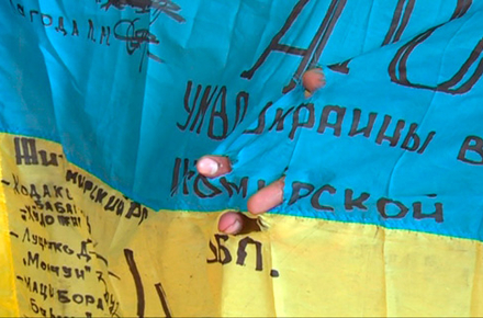 Привезений із зони АТО прапор майорить написами, зробленими самими бійцями чорним маркером. Ось так просто відображені тут імена тих, хто воював під українським прапором у неоголошеній війні за мир, спокій, правопорядок у своїй державі, на рідній землі.