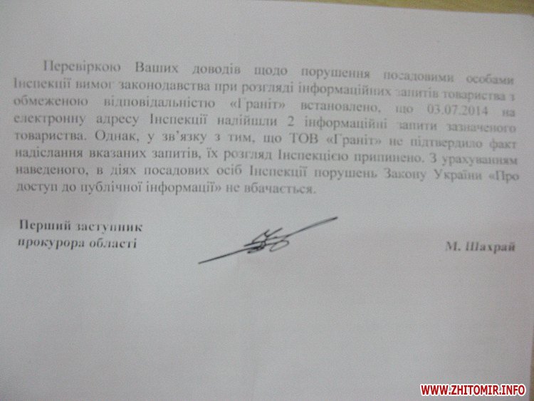 На підтвердження своїх слів очільник Громадської ради продемонстрував лист прокуратури Житомирської області від 26 серпня 2014 року, підписаний першим заступником прокурора області Миколою Шахраєм, у якому йдеться: