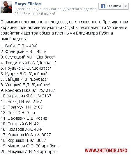"В рамках переговорного процесса, организованного президентом Украины, при активном участии Службы безопасности Украины и содействии Центра обмена пленными Владимира Рубана освобождены: