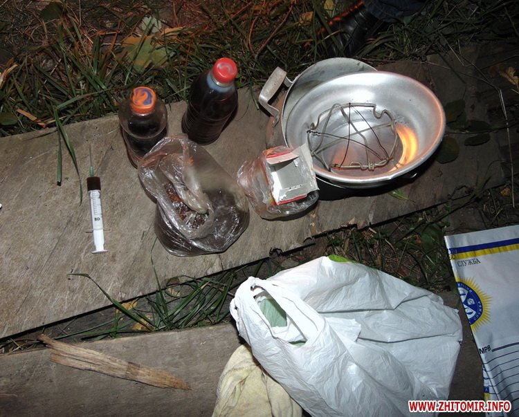 «О том, что в одном из домохозяйств в г. Коростене неизвестные принимают наркотики, в милицию сообщили местные жители. Было установлено, что по указанному адресу проживает 46-летний ранее судимый коростенець. Указанный двор правоохранители взяли на контроль. На момент прибытия правоохранителей в домохозяйстве как раз готовилось наркотическое варево. Кроме хозяина, в летней кухне находились еще двое мужчин, которые были в неадекватном состоянии из-за принятых наркотиков. Подтверждением этому стало обнаруженые милиционерами в помещении использованных шприцев, многочисленных пакетов с содой и растворителем, двух пластмассовых бутылок ацетилированного опия и медицинского шприца, заполненного жидкостью коричневого цвета, а также разнообразного оборудования для изготовления наркотических средств», - сообщают правоохранители.
