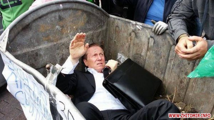 Колишнього регіонала Віталія Журавського неподалік парламенту активісти «автомайдану» посадили у смітник. За їхніми словами, причина - ганебні голосування нардепа.