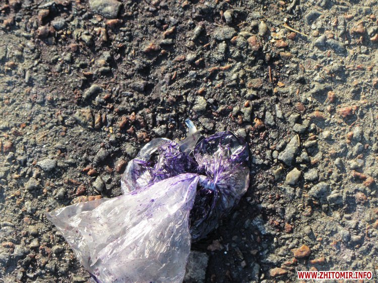 На улице 1-го Мая билборд Тигипко заляпали веществом фиолетового цвета. На асфальте под рекламным щитом разбросаны одноразовые кульки, которые, видимо, были наполнены фиолетовой жидкостью и служили «бомбами».