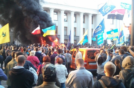 Після того, як були проголосовані закони про особливий статус Донецької і Луганської областей та ратифікована Угода про асоціацію з ЄС, парламентарі пішли на перерву, а під ВР з’явилися автомобільні шини.