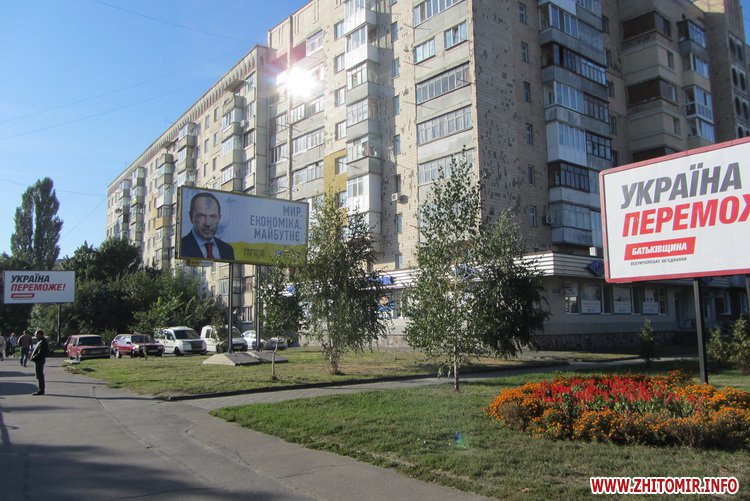 Так, на пятачке возле перекрестка улиц Киевская-Шелушкова сразу четыре билборда партии Юлии Тимошенко. Реклама есть и на лайтпостерах, которые появились в центре Житомира недавно (подробности – в интервью Сергея Сухомлина), и на сити-лайтах вдоль дорог.