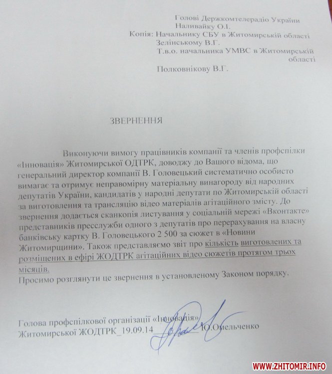 «Виконуючи вимогу працівників компанії та членів профспілки «Інновація» Житомирської ОДТРК, доводжу до Вашого відома, що генеральний директор компанії В. Головецький систематично особисто вимагає та отримує неправомірну матеріальну винагороду від народних депутатів України, кандидатів у народні депутати по Житомирській області за виготовлення та трансляцію відео матеріалів агітаційного змісту. До звернення додається сканкопія листування у соціальній мережі «Вконтакте» представників прес-служби одного з депутатів про перерахування на власну банківську картку В. Головецького 2 500 за сюжет в «Новини Житомирщини». Також представляємо звіт про кількість виготовлених та розміщених в ефірі ЖОДТРК агітаційних відео сюжетів протягом трьох місяців», - йдеться у зверненні за підписом голови профспілкової організації «Інновація» Юрія Омельченка.