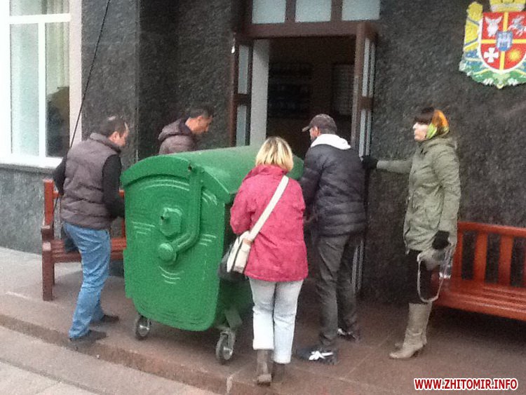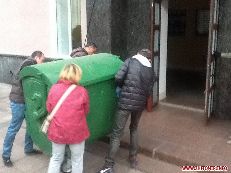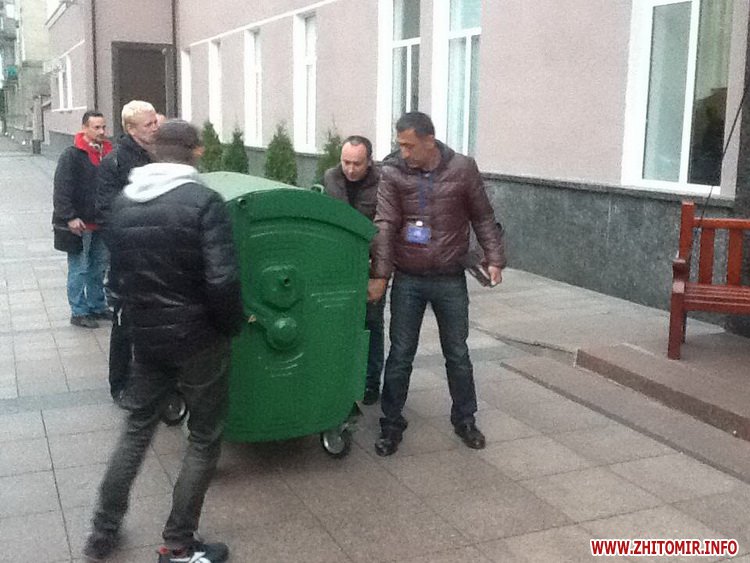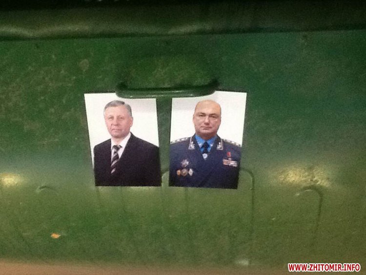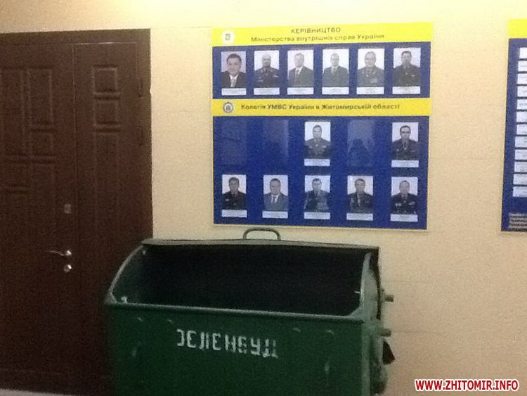 Несколько человек сначала подкатили мусорный бак ко входу в управление МВД, затем вкатили его в холл центрального здания управления. Чуть позже на крышке бака оказались снятые со стенда фотографии заместителей министра МВД Сергея Чеботаря и Владимира Евдокимова.
