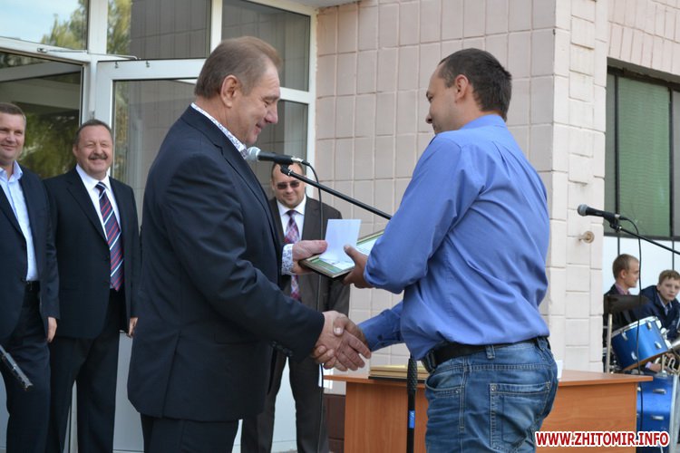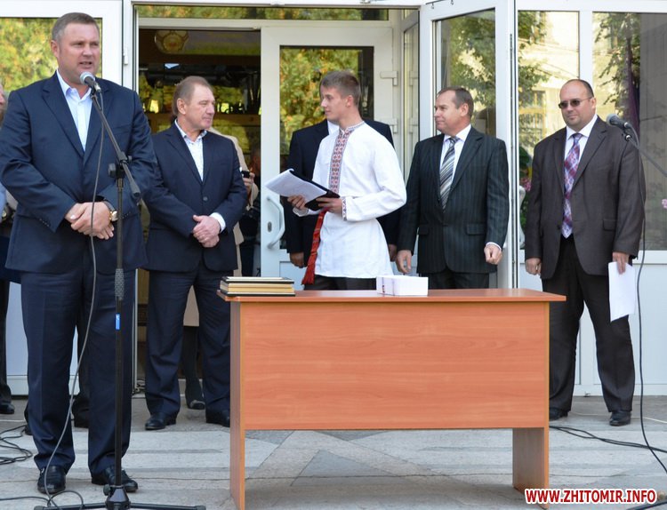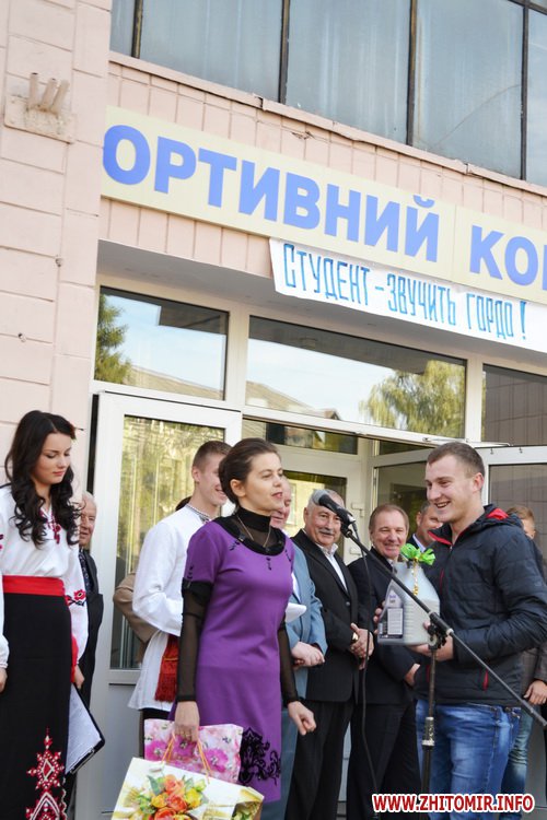 «Завжди приємно повертатись в місце, з яким тебе пов’язують найкращі спогади, – зазначив під час привітань голова Житомирської міської організації роботодавців Олександр Оніщук. – В мене тут було багато друзів. Крім навчання, я активно займався спортом, – був капітаном збірної команди з волейболу. В той час потреби у випускниках нашого учбового закладу були дуже великі: нас запрошували до багатьох міст України, нам завжди були відкриті двері, куди б ми не йшли і куди б не їхали. Ви обрали престижний заклад, у якому викладацький колектив віддає душу і свій досвід, вважаючи вас своїми дітьми як це робили упродовж 85 років існування закладу. А в нинішній не простій ситуації, яка склалась в Україні, насамперед бажаю усім вам мирного неба над головою, жити і навчатись в міцній суверенній державі, пишатись тим, що є студентами цього коледжу й успішно використовувати здобуті знання і досвід для розвитку української держави».