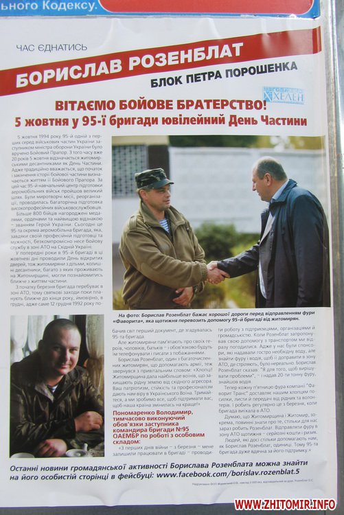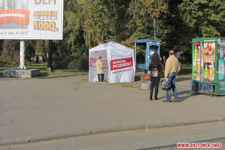 Избирательная компания очень короткая, поэтому надо успеть быстро донести житомирянам преимущества и выгоды своего кандидата. Для этого кроме билбордов и сити-лайтов используются стенды возле подъездов, растяжки на домах, столики и палатки с «раздаточным материалом».