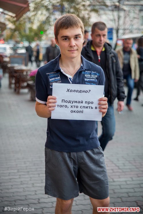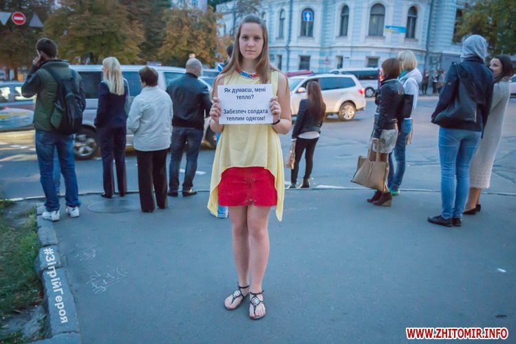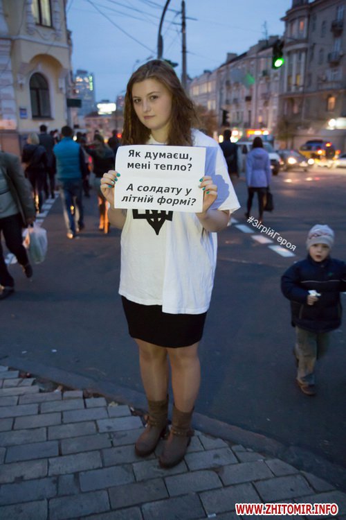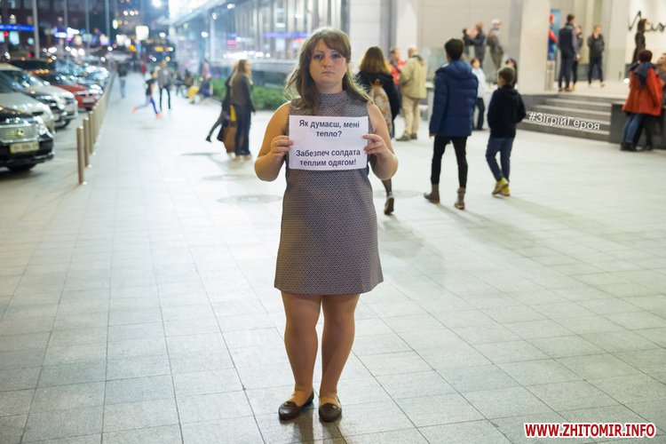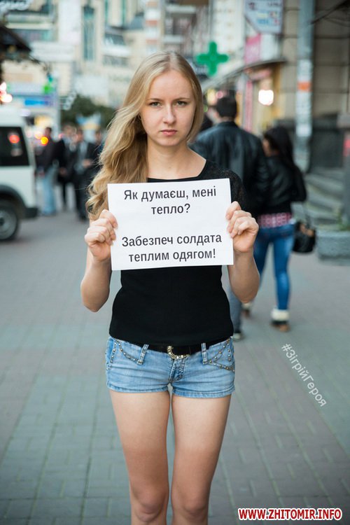 У Києві активісти та волонтери провели показовий флешмоб, аби продемонструвати громадянам, що, в той час, як у них є можливість одягти теплі куртки та светри, наші вояки не мають звичайної термобілизни та спальників, які б захистили їх з настанням холодів. Також метою флешмобу є збір коштів на теплу білизну та зимові спальники для 95-ї окремої аеромобільної бригади.