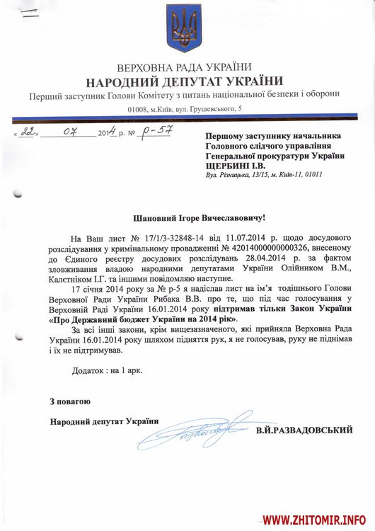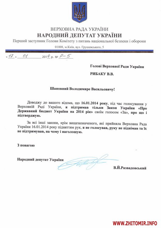 Про те, що народний депутат України Віктор Развадовський не голосував за так звані «диктаторські закони», бо не схвалював ані їх змісту, ані способу прийняття він письмово повідомив 17 січня керівництво Верховної Ради України та оприлюднив відповідну заяву у засобах масової інформації. Достовірність такого твердження зафіксовано і на фотосвітлині.