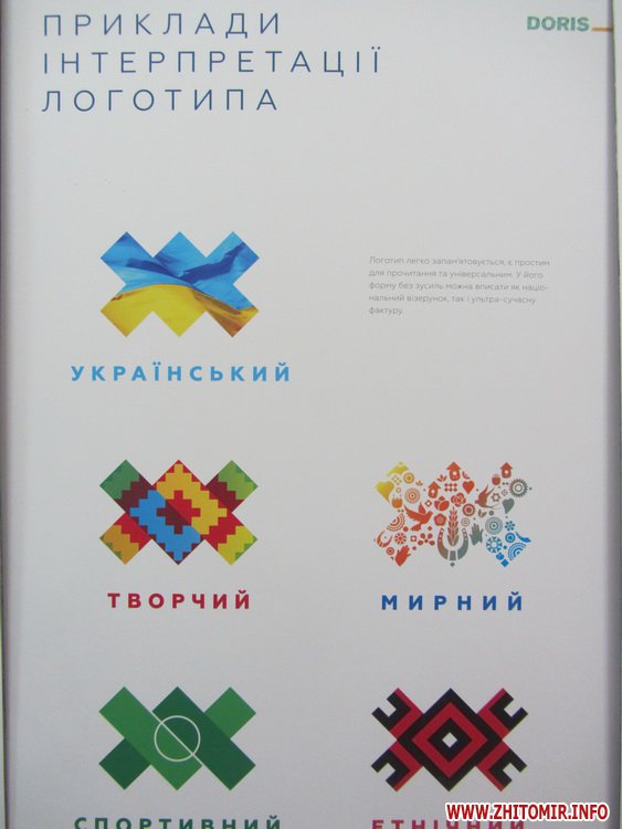 Основа ідеї логотипу – геометрична фігура, яка є центральною у більшості поліських орнаментів із прадавніми елементами ромбів, похресть, смужок, що властиві вишивці, ткацтву, різьбярству, писанкарству та гончарству Житомирщини.