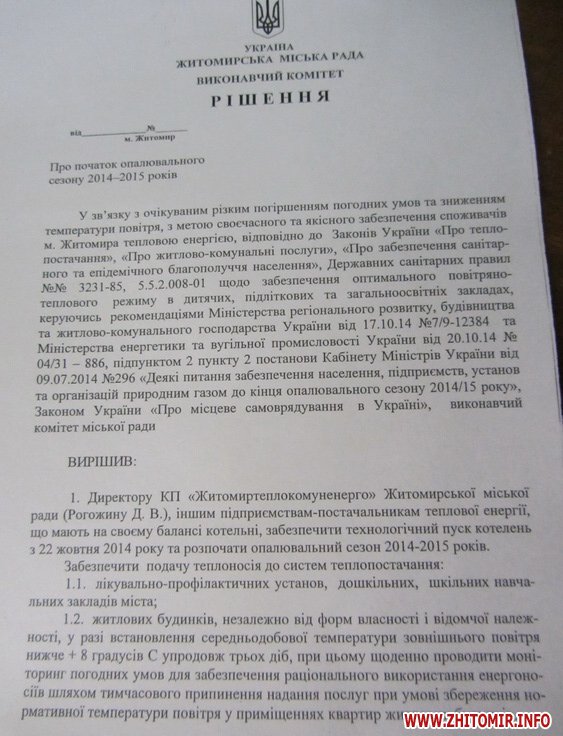«У зв’язку з очікуваним погіршенням погодних умов та зниженням температури повітря, з метою своєчасного та якісного забезпечення споживачів м. Житомира тепловою енергією, виконавчий комітет міської ради вирішив: директору КП «Житомиртеплокомуненерго» Житомирської міської ради (Рогожину Д. В.), іншим підприємствам-постачальникам теплової енергії, що мають на своєму балансі котельні, забезпечити технологічний пуск котелень з 22 жовтня 2014 року та розпочати опалювальний сезон 2014-2015 років.