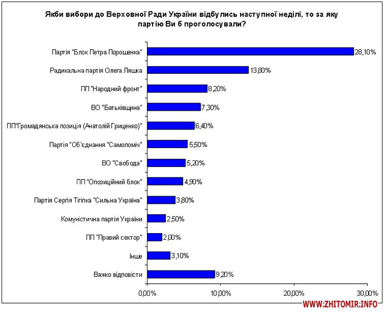 Згідно соціологічного дослідження «Громадської думки», оприлюдненого сьогодні на прес-конференції в Укрінформі: «рівень підтримки партії «Блок Петра Порошенка», дорівнює 28% громадян. На другому місці опинилась Радикальна партію Олега Ляшка, яку підтримують майже 14% опитаних, політична партія «Народний фронт» отримала 8%» - заявив Володимир Подгорнов, президент фонду. На його думку, такий тренд залишиться і до дня виборів, що власне і стане фінальним результатом парламентської кампанії.