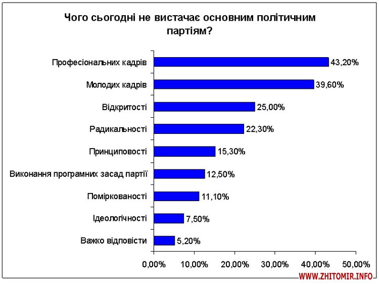 Згідно з результатами дослідження майже половина населення України вважає, що політичні партії мають сприяти залученню справжніх фахівців, професіональних кадрів (цю ідею підтримують 43% опитаних) і запобігати їхньому відтоку, а також більше уваги приділяти молодим кадрам (цю ідею підтримують майже 40% опитаних). Існуючі партії мають продемонструвати відкритість (на цьому наголошує ¼ опитаних) та радикальність (про це заявляють понад 20% опитаних) у вирішенні нагальних питань. Водночас на ідеологічності стосовно вирішення конкретних проблем, що турбують простих громадян наголошують лише до 7,5% опитаних.