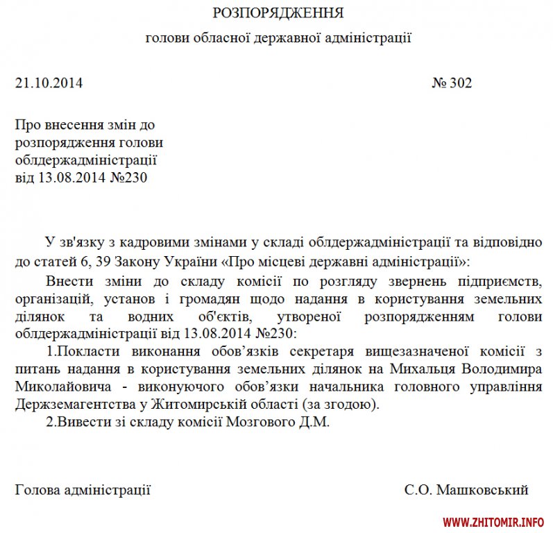 «Внести изменения в состав комиссии по рассмотрению обращений предприятий, организаций, учреждений и граждан о предоставлении в пользование земельных участков и водных объектов, созданной распоряжением председателя облгосадминистрации от 13.08.2014 №230: 1.Возложить выполнение обязанностей секретаря вышеупомянутой комиссии по вопросам предоставления в пользование земельных участков на Михальца Владимира Николаевича – исполняющего обязанности начальника главного управления Госземагентства в Житомирской области (по согласованию). Вывести из состава комиссии Мозгового Д.Н.», - говорится в распоряжении от 21 октября 2014 года.