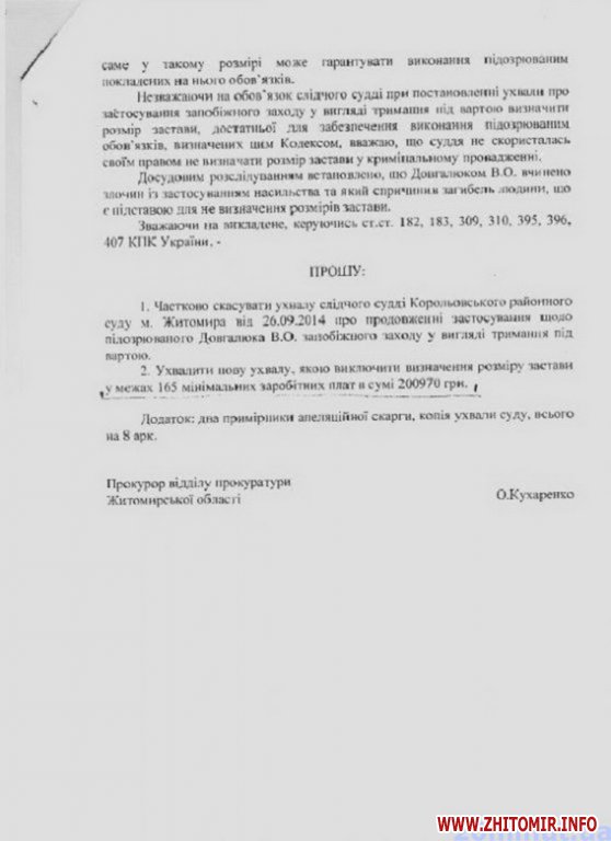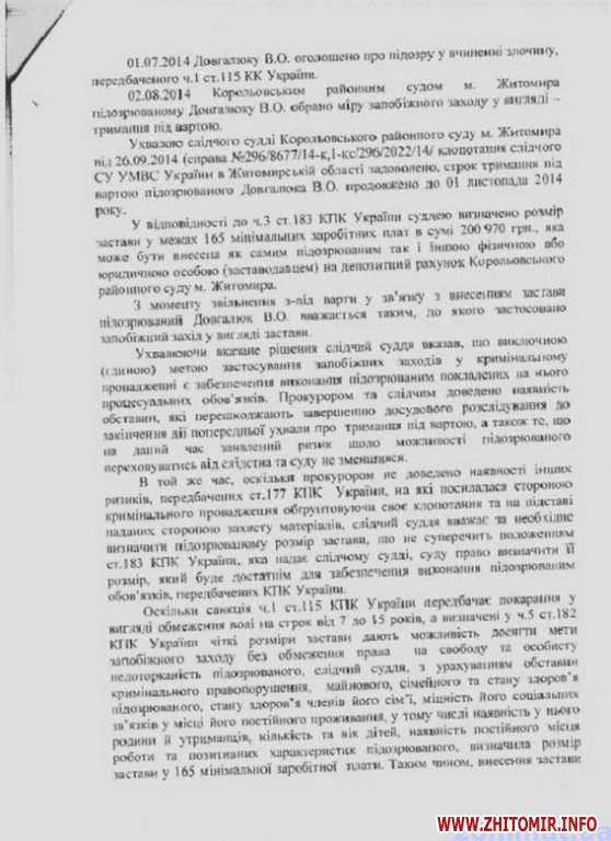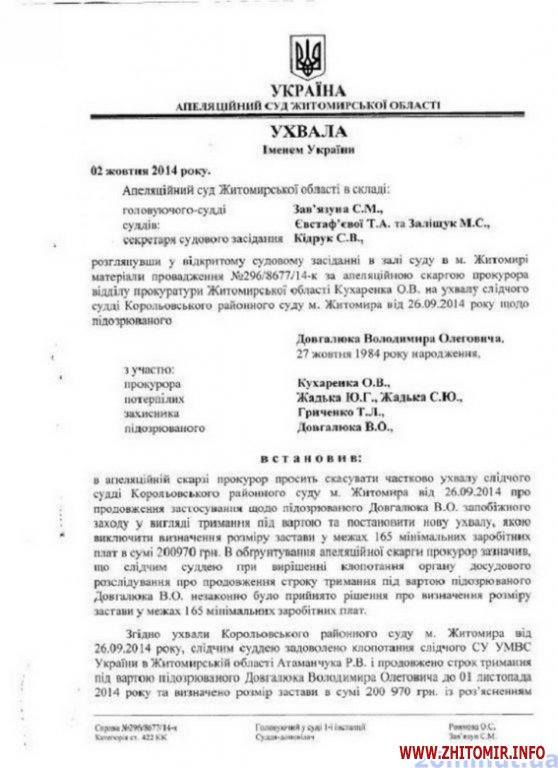 Підсудному винесено рішення щодо тримання під вартою. 26 вересня слідчий Роман Атаманчук звернувся до суду з клопотанням про продовження строку тримання під вартою до 1 листопада цього ж року. Під час розгляду справи в Корольвському райсуді суддею Оленою Рожковою було визначено розмір застави у сумі 200 970 гривень. І це попри доводи прокурора, слідчого та потерпілих про те, що підсудний може становити загрозу свідкам, уникнути правосуддя та вплинути на розгляд справи приховуванням доказів. Тобто, фактично, до 1-го листопада на свободі опинився жорстокий убивця, що може становити небезпеку оточуючим. Не зрозуміло, що буде далі, адже це перший крок до цілковитого звільнення злочинця.