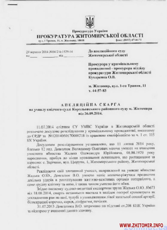 Витяг зі справи: Досудовим розслідуванням установлено, що 11 липня 2014 року, близько 12 год. Довганюк Володимир Олегович, маючи умисел на вчинення умисного вбивства Жадька Олександра, прибув до місця проживання останнього.