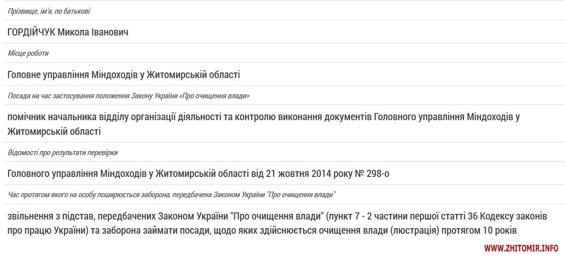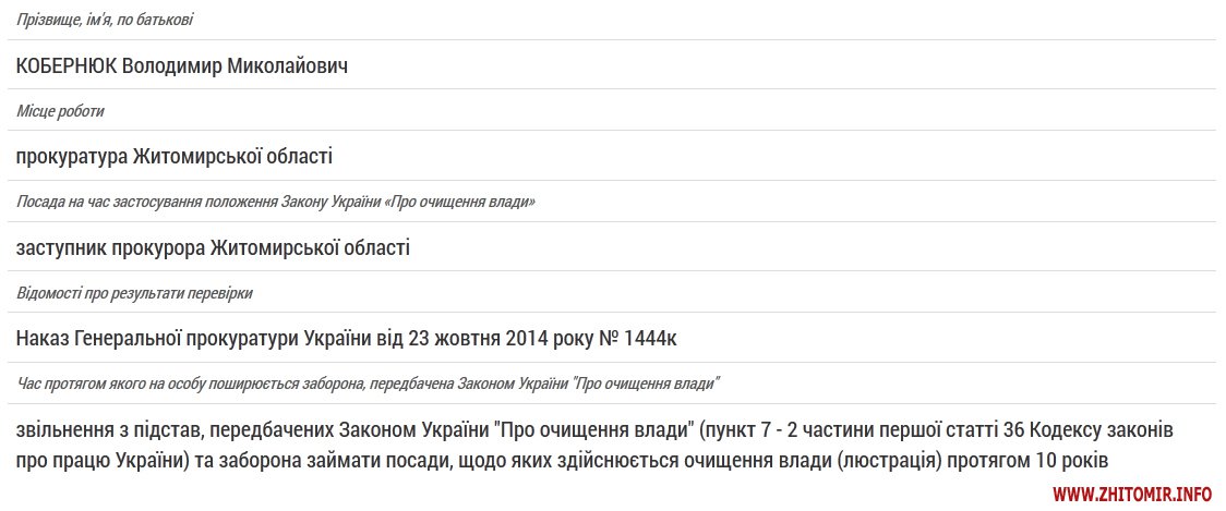 Станом на 28 жовтня у списку люстрованих: Микола Дейсан – генеральний директор державного підприємства «Житомирський науково-виробничий центр стандартизації, метрології та сертифікації»; Микола Гордійчук – помічник начальника відділу організації діяльності та контролю виконання документів Головного управління Міндоходів у Житомирській області; Володимир Кобернюк – заступник прокурора Житомирської області.