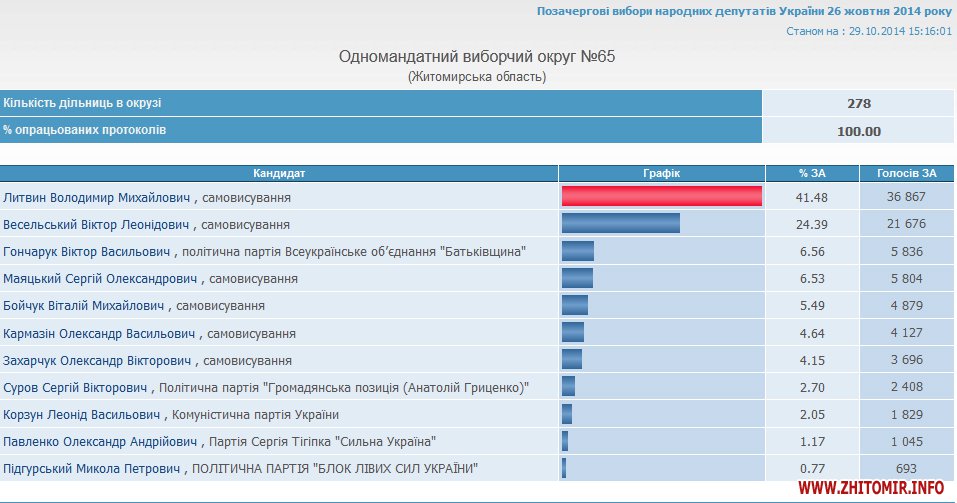 Как сообщал Житомир.info, явка избирателей в округе №65 была самой высокой в области – 58,32% (проголосовали 90796 чел. из 155674).