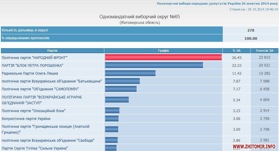 Голоса за политические партии и блоки в округе №65 распределились следующим образом: Народный фронт – 26,45%; Блок Петра Порошенко – 22,23%; Радикальная партия Олега Ляшко – 11,42%; ВО «Батькивщина» - 7,87%, Самопомич – 7,17%; ВАО «Заступ» - 5,34%.
