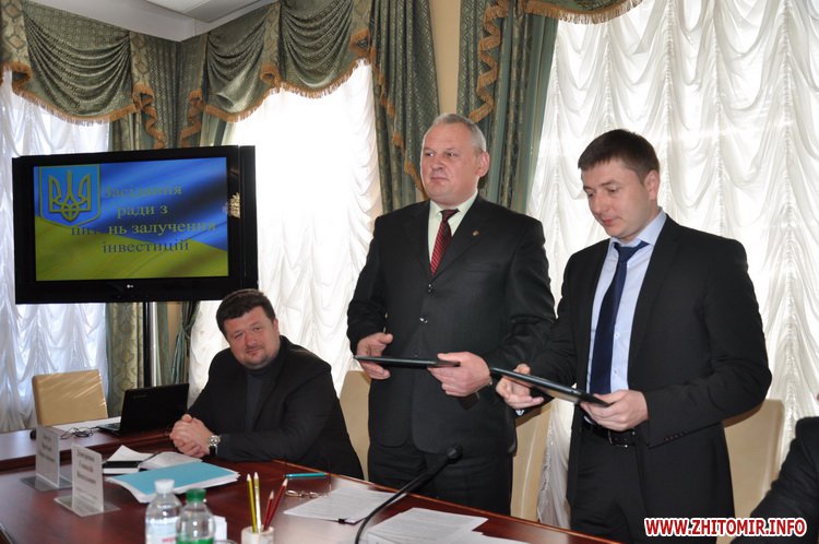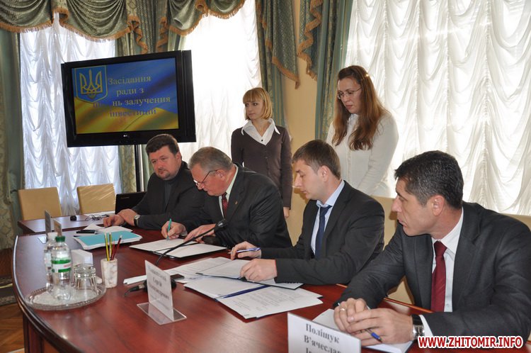 У рамках першого засідання ради з питань залучення інвестицій керівник області Сергій Машковський від імені Житомирської обласної державної адміністрації з однієї сторони та керівники підприємств ПСП «Україна» Олексій Прохоренко і ТОВ «УКРТРАНСРЕЙЛ» Ельбрус Абдуллаєв з іншої сторони підписали два меморандуми про співпрацю.
