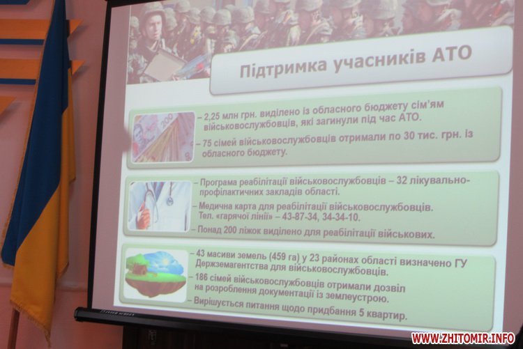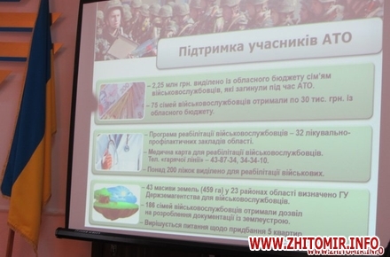 «К сожалению, количество погибших в Житомирской области одно из самых больших в Украине. На сегодня оно составляет 89 человек. из областного бюджета были выделены деньги в сумме 2 млн. 300 тыс.грн. для одноразовой материальной помощи семьям погибших в размере 30 тысяч на каждую семью. Но на следующей сессии (облсовета), которая состоится 20 ноября, будет дополнительно выделено еще 500 тысяч, т.к. количество погибших увеличилось», - сказал Машковский.